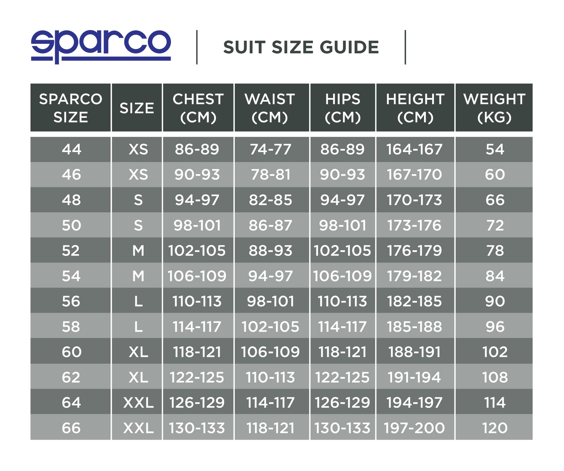 Sparco-Größentabellen
